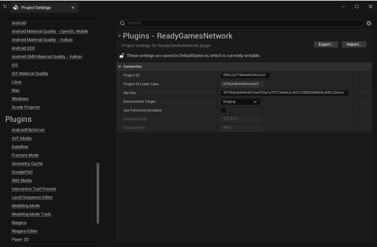 Open the project settings and scroll down to the Plugins category and find the “ReadyGamesNetwork”, then fill the ProjectId and ApiKey fields by values from your console project.