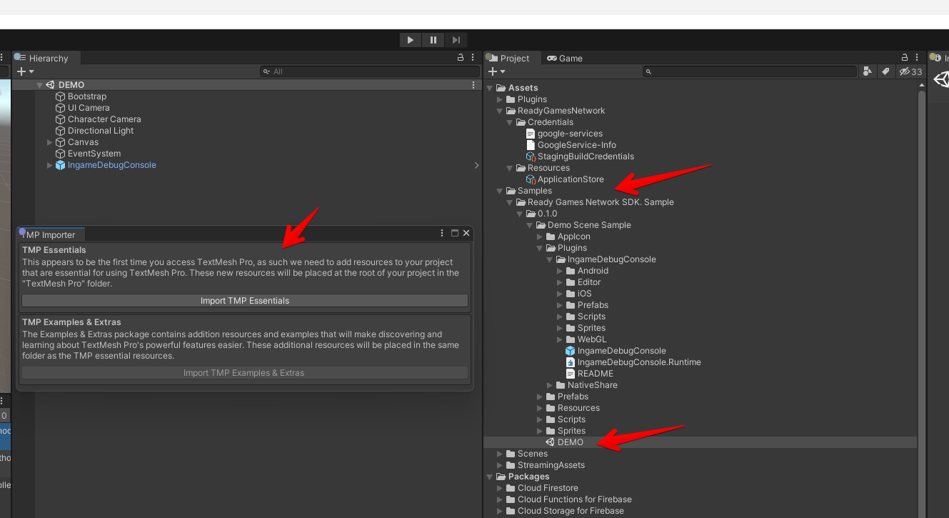 After you import the Sample, you'll see a new folder in your Assets folder. You can open the DEMO scene from the Sample. Unity will ask you to import the TextMeshPro Essentials in case you have not done it already